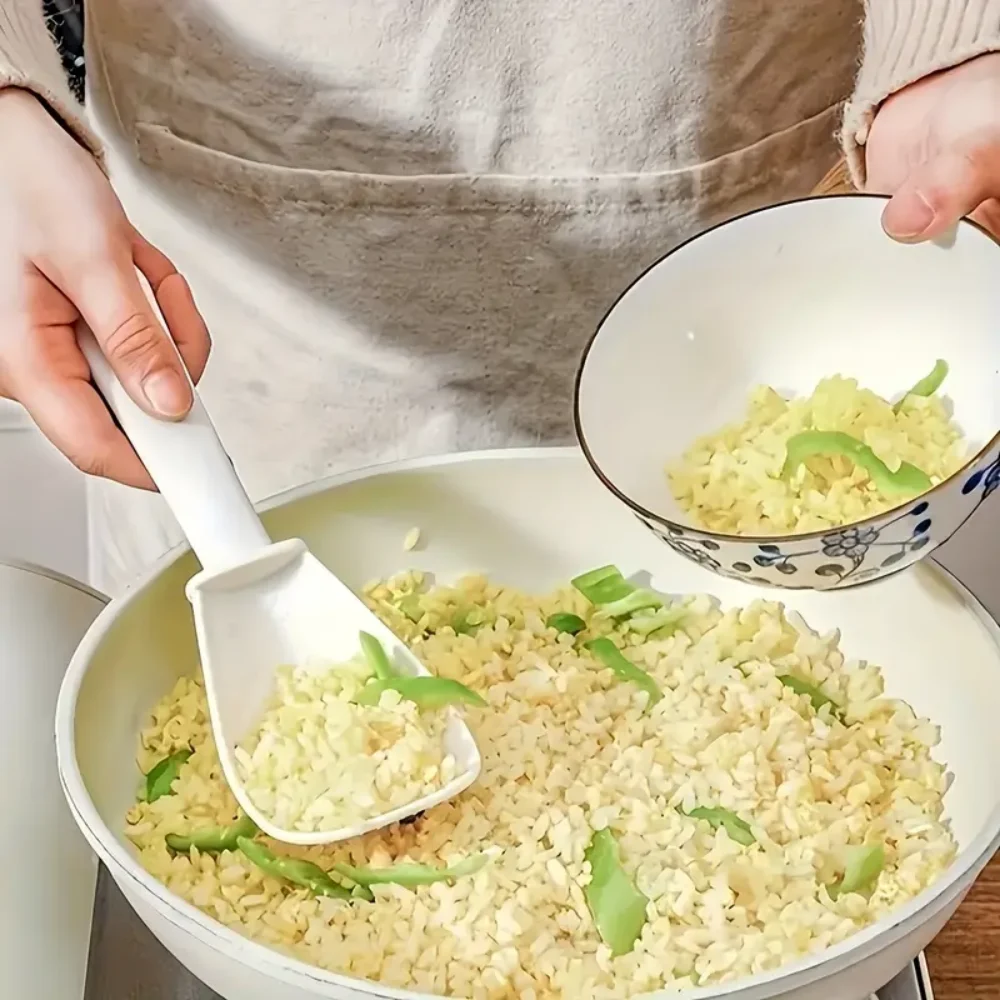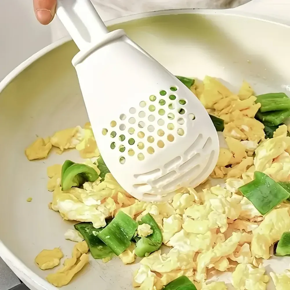 Creative design: 1. Arc-shaped design, easy to scoop up food and less likely to leak. 2. With concave and convex serrations, it is convenient for draining water, grinding and crushing, and is practical and convenient. 3. The rear hanging hole allows for suspension without taking up much space.